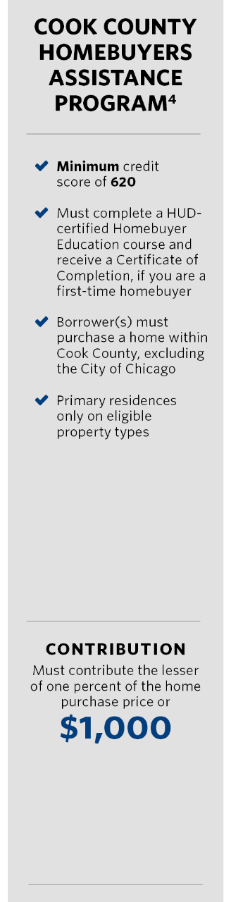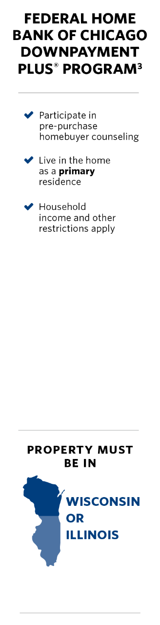 1. Restrictions apply. 2. First-time borrowers must complete a city approved HUD-certified Homebuyer Education Course and receive a certificate of completion. Down payment assistance guidelines are subject to change at any time and without notice. 3. Geographic restrictions apply. Grant can be awarded in any amount from $3,000 to $6,000 based on three times the homebuyer’s contribution. Downpayment assistance loan limit is subject to change at any time and without notice. The downpayment may not be combined with any other FHLBC assistance for the same borrower in the same transaction. The grant is forgiven on a pro rata basis over a 60-month period and is based on the number of full moths the home is owned. 4. Downpayment assistance guidelines are subject to change at any time and without notice. 5. Eligible uses of grant: downpayment, closing cost assistance, escrow reserves deposited with the lender for property taxes, insurance, or monthly assessment and principal reduction on the loan. Must be 1-2 units and the borrowers primary residence. Home must be located within the six-county Metro Chicagoland Area (Cook, DuPage, McHenry, Will, Kane and Lake Counties), Lake County Indiana, and the Wisconsin counties of Kenosha, Racine, Milwaukee, Waukesha, Dane, Rock, Green, Gefferson, Layfayette and Wallworth. For a full list of nonprofit partners and what area each covers, vitist wintrust.com/buyergrant. Income limits based on U.S. Department of Housing and Urban Development’s median income by county.