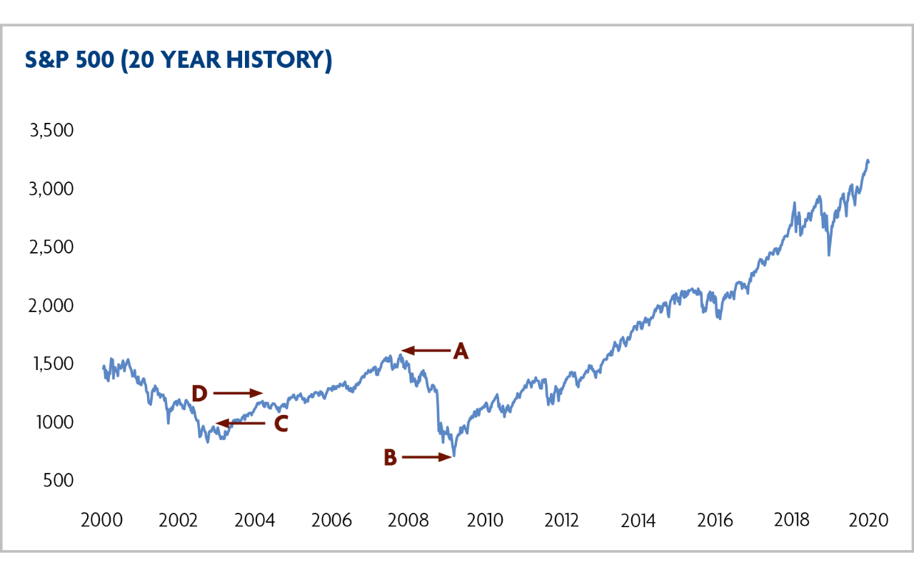 As shown in the graphic to the right, if a large percentage of your retirement portfolio was in the market in 2008 (point A), it may have dropped substantially in value (point B). Based on the S&P 5002 year-end returns for 2008, a $100,000 investment portfolio value would have dropped to $61,500. If you were fortunate to have assets in the market in 2003 (point C), your $100,000 would have risen to $126,400 based on the S&P 500 year-end returns for 2003 (point D). While market volatility can generate positive long-term rewards over time, it can also have a negative impact on investment portfolios during shorter time frames.