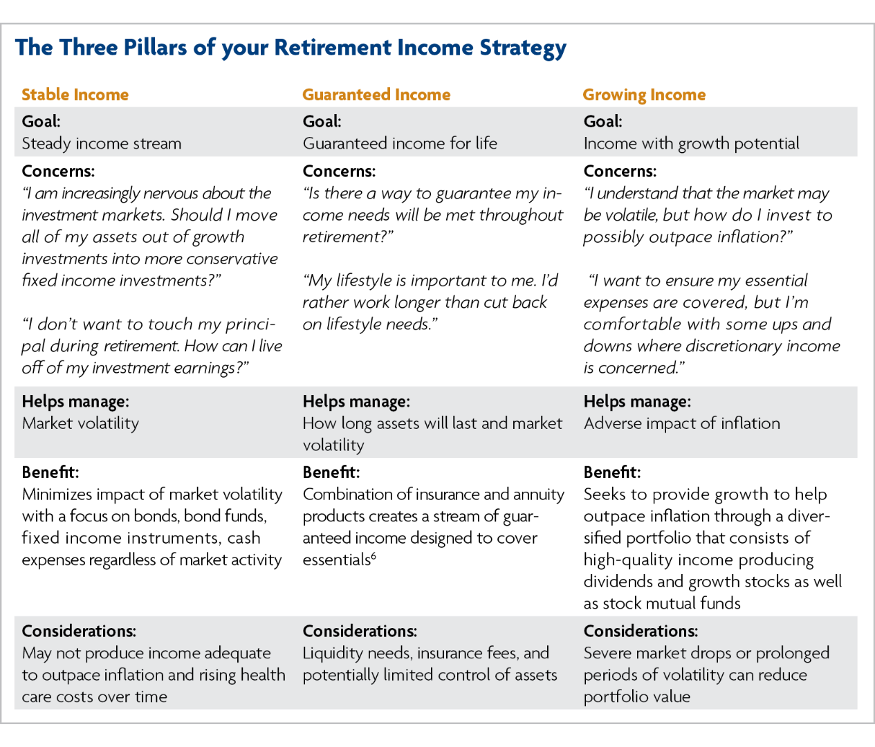 Achieving the right balance to ensure your income needs are met throughout retirement requires a comprehensive retirement income plan and strategies that holistically address: