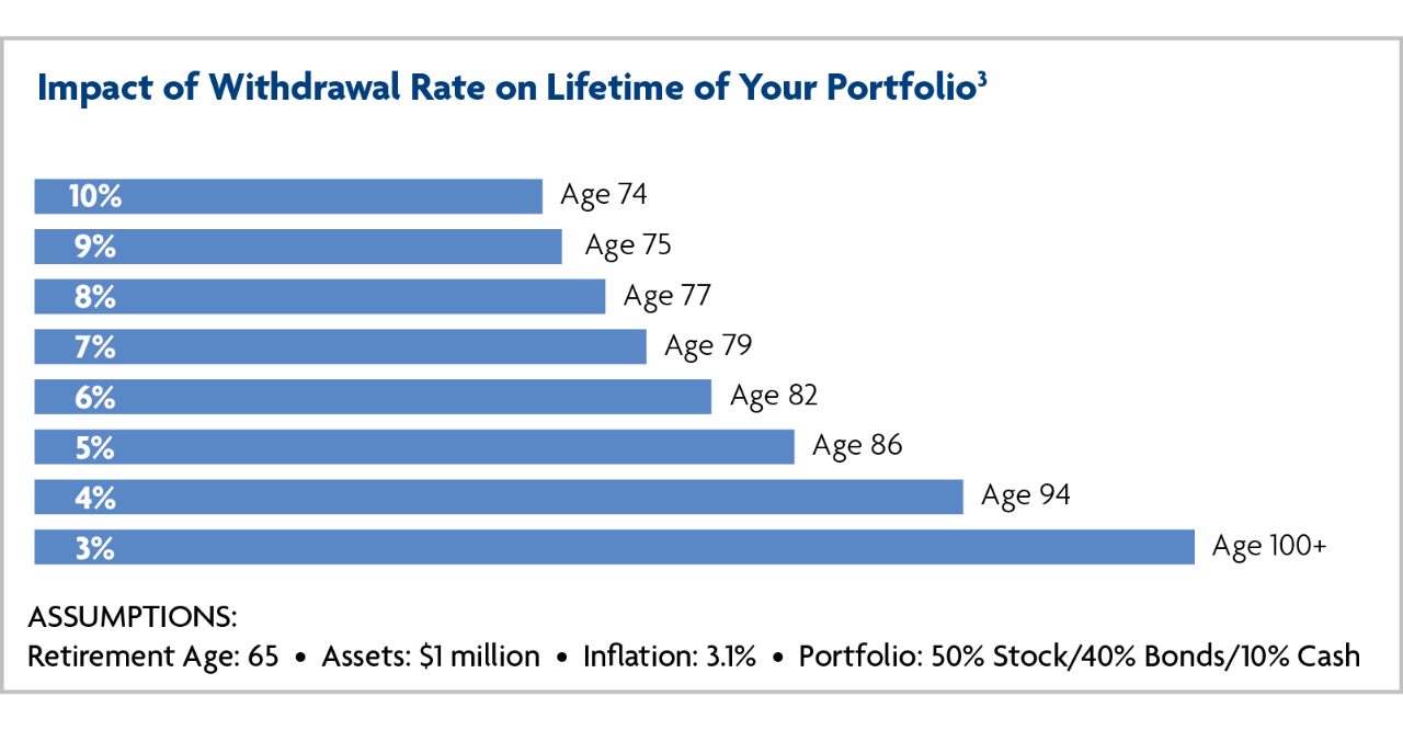 For most individuals, an essential part of retirement income planning is determining an appropriate withdrawal or spending strategy. What is the appropriate withdrawal rate for you—4%? 5%? 6%? By establishing a withdrawal rate that’s too high, you could potentially outlive your money. As the graphic to the right shows, the rate at which you withdraw from your retirement savings is a central factor in the sustainability of your retirement portfolio.